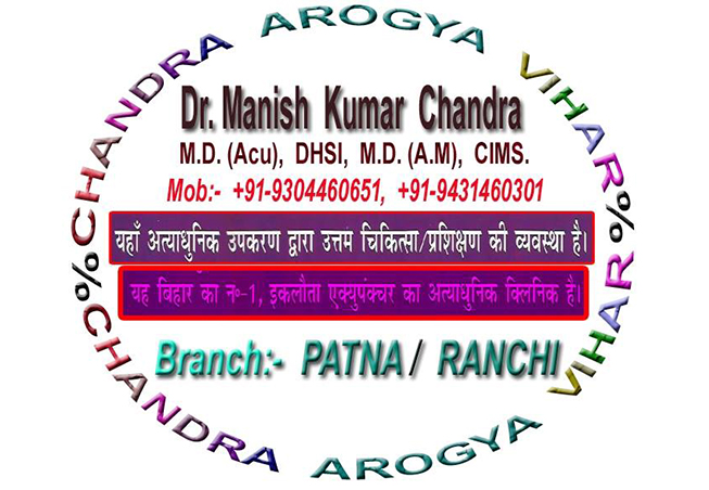 Dr. Manish Kumar Chandra is a trusted Acupuncturist in Raja Bajar Patna Bihar. He has helped numerous patients in her 12 years of experience as a Acupuncturist. She is a qualified M.D(Acu.), DHSI, M.D.(A.M.), CIMS. You can meet Dr. Manish Kumar Chandra personally at Chandra Arogya Vihar Acupuncture Clinic in Raja Bajar, Patna. Book an appointment online with Dr. Manish Chandra on this number 9304460651 and consult privately on Clinic.